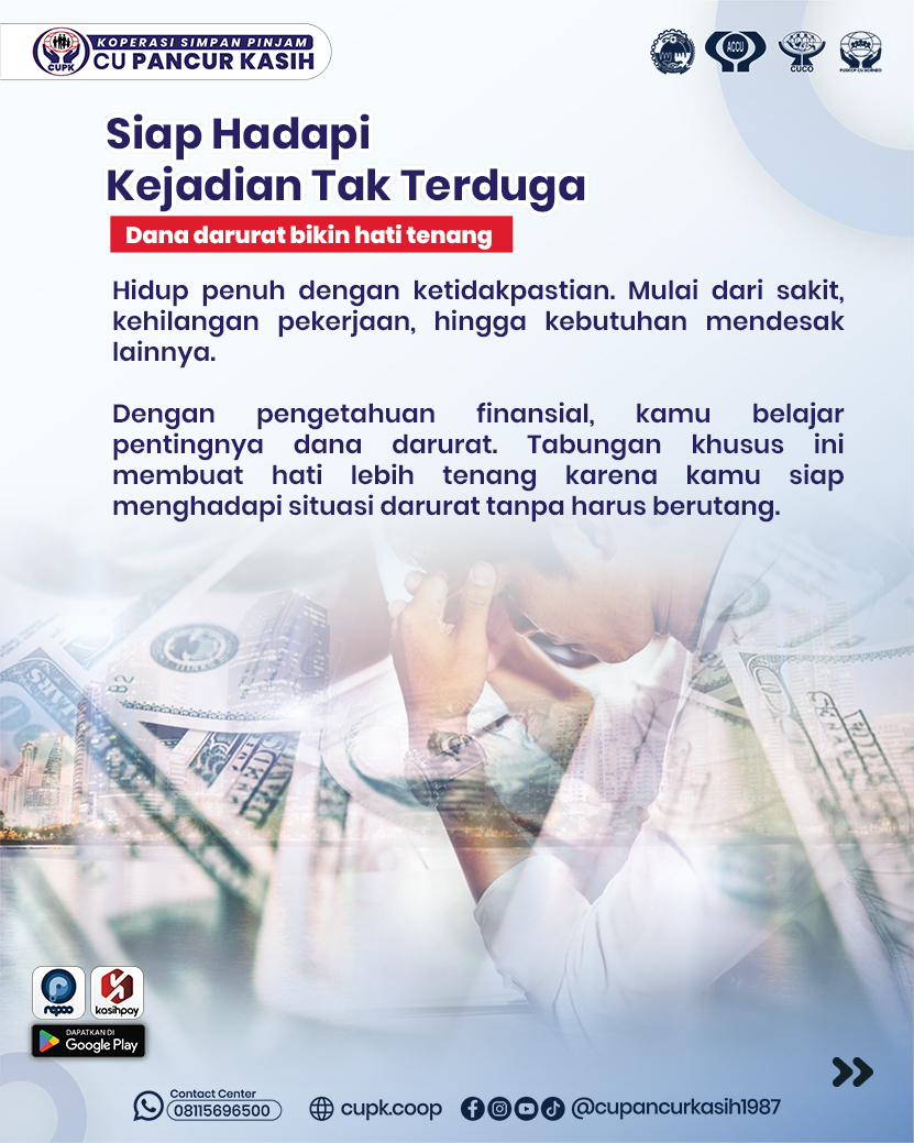 Hidup penuh dengan ketidakpastian. Mulai dari sakit, kehilangan pekerjaan, hingga kebutuhan mendesak lainnya. Dengan pengetahuan finansial, kita belajar pentingnya dana darurat. Tabungan khusus ini membuat hati lebih tenang karena kita siap menghadapi situasi darurat tanpa harus berutang. |