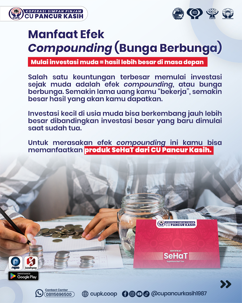 Salah satu keuntungan terbesar memulai investasi sejak muda adalah efek compounding, atau bunga berbunga. Semakin lama uang kita “bekerja”, semakin besar hasil yang akan kita dapatkan. Investasi kecil di usia muda bisa berkembang jauh lebih besar dibandingkan investasi besar yang baru dimulai saat sudah tua. |