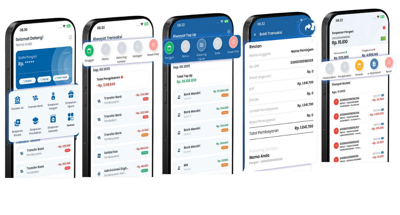 Riwayat transaksi, mutasi rekening, dan rekap keseluruhan aktivitas keuangan tersedia dalam satu tampilan yang jelas sehingga anggota dapat memantau setiap gerakan tabungan dengan transparan