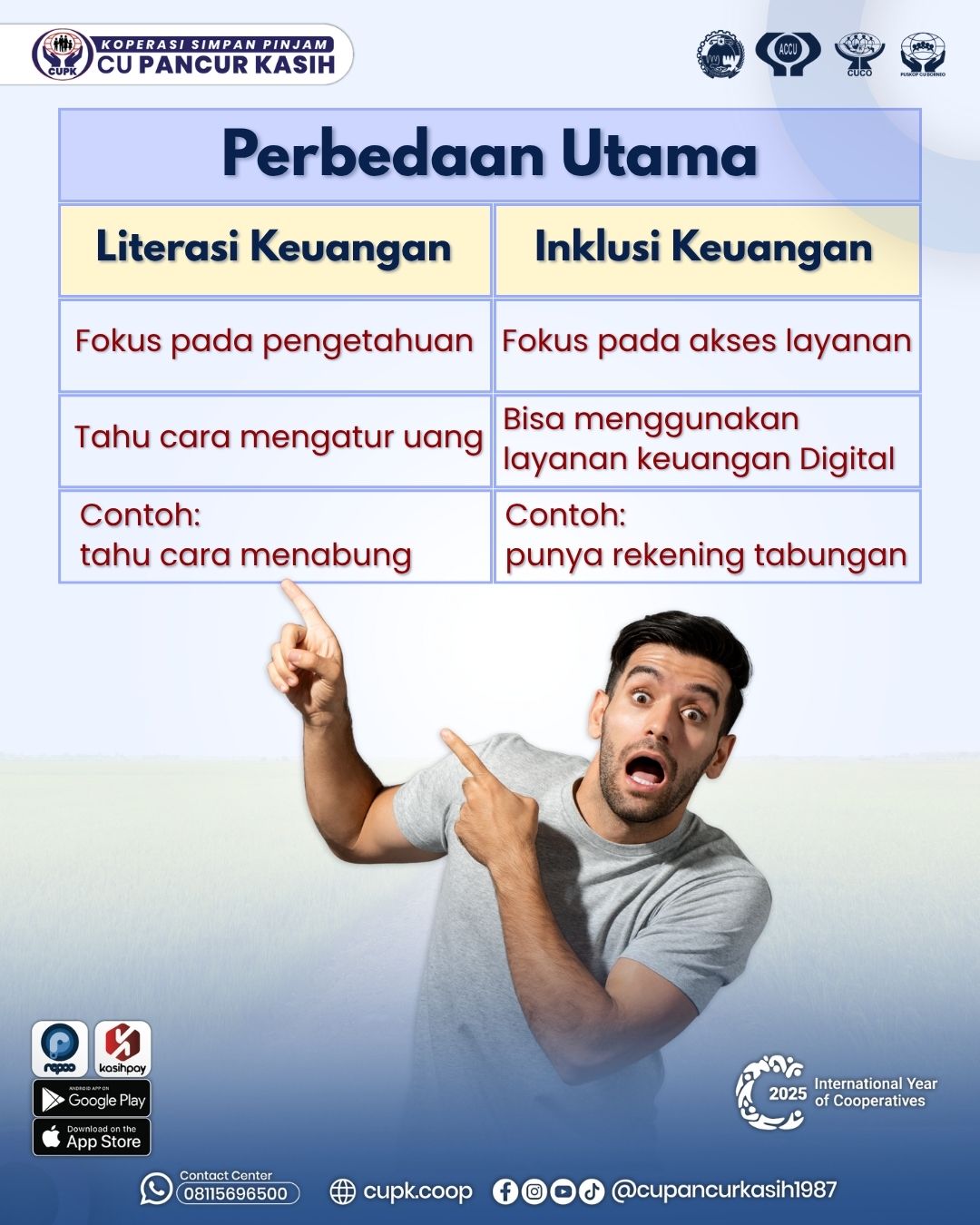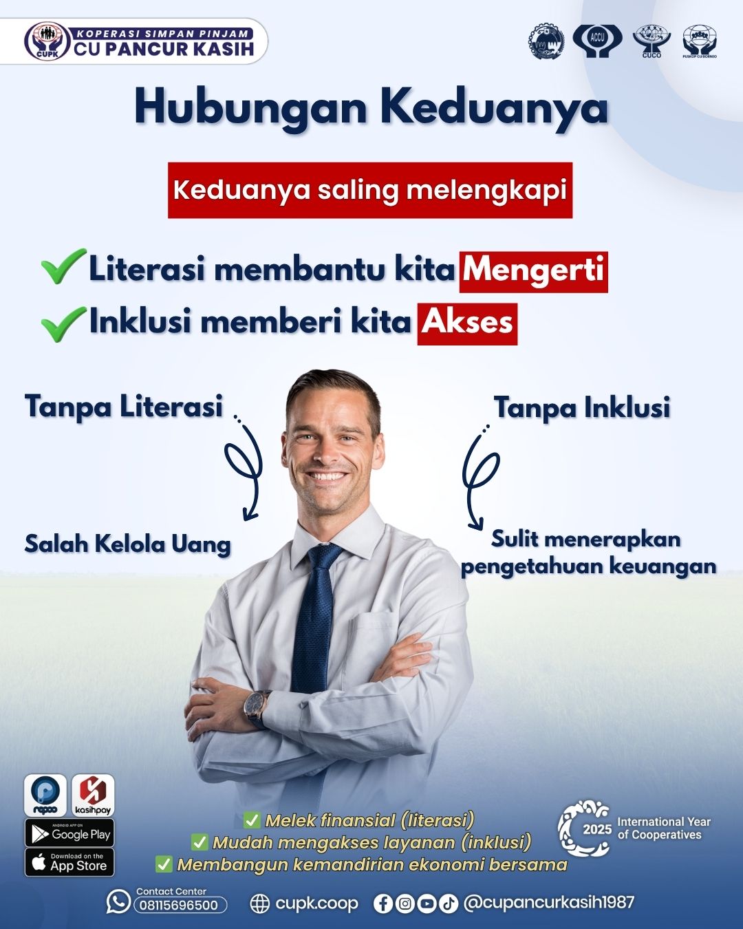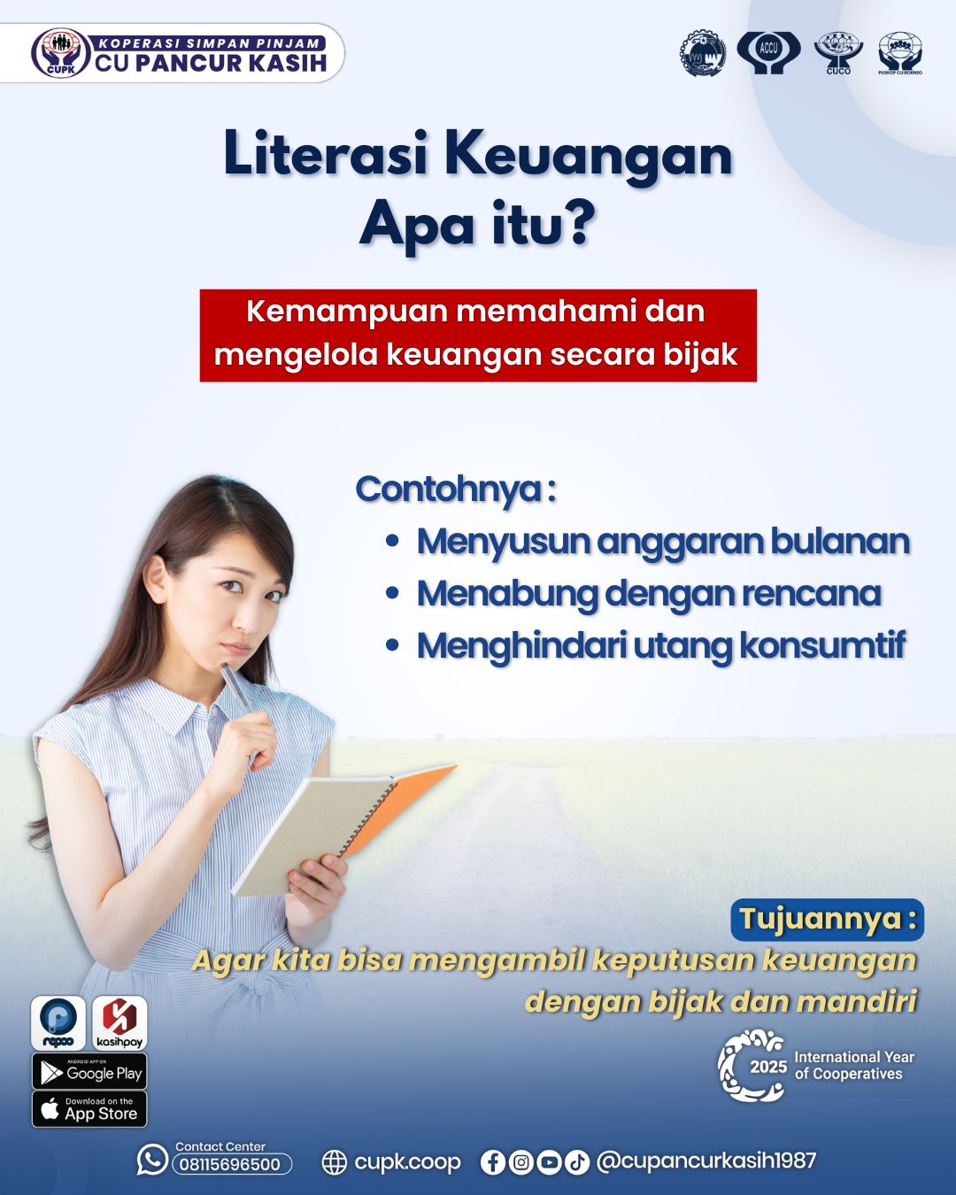 Artinya, seseorang yang melek finansial tahu bagaimana mengatur pendapatan, menabung secara terencana, menghindari utang yang tidak perlu, serta berinvestasi untuk masa depan. Contohnya sederhana: ketika seseorang tahu cara membuat anggaran bulanan, membedakan antara kebutuhan dan keinginan, serta memiliki rencana keuangan jangka panjang — itu berarti ia memiliki tingkat literasi keuangan yang baik.Di CU Pancur Kasih, kemampuan ini sangat penting agar anggota dapat memanfaatkan berbagai produk simpanan dan pinjaman secara cerdas, bukan sekadar mengikuti tren atau kebutuhan sesaat.