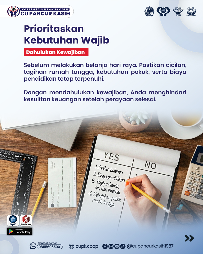 | Kedua, prioritaskan kebutuhan wajib sebelum melakukan belanja hari raya. Pastikan cicilan, tagihan rumah tangga, kebutuhan pokok, serta biaya pendidikan tetap terpenuhi. Dengan mendahulukan kewajiban, Anda menghindari kesulitan keuangan setelah perayaan selesai. | ![]() |