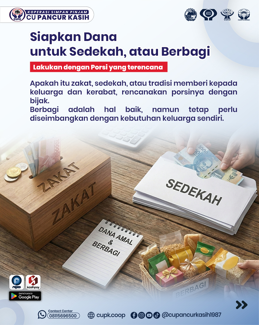Kelima, alokasikan dana untuk berbagi dan kewajiban ibadah. Apakah itu zakat, sedekah, atau tradisi memberi kepada keluarga dan kerabat, rencanakan porsinya dengan bijak. Berbagi adalah hal baik, namun tetap perlu diseimbangkan dengan kebutuhan keluarga sendiri. |