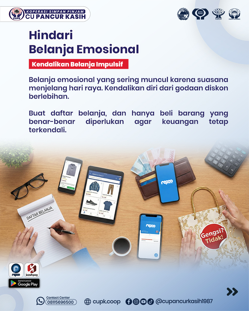 | Keenam, hindari belanja emosional yang sering muncul karena suasana menjelang hari raya. Kendalikan diri dari godaan diskon berlebihan, buat daftar belanja, dan hanya beli barang yang benar-benar diperlukan agar keuangan tetap terkendali. | ![]() |